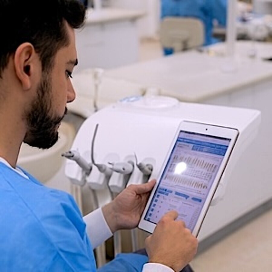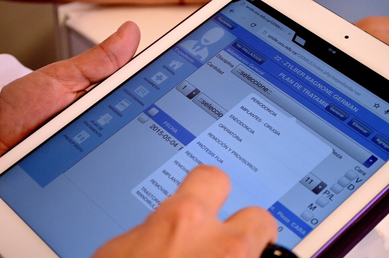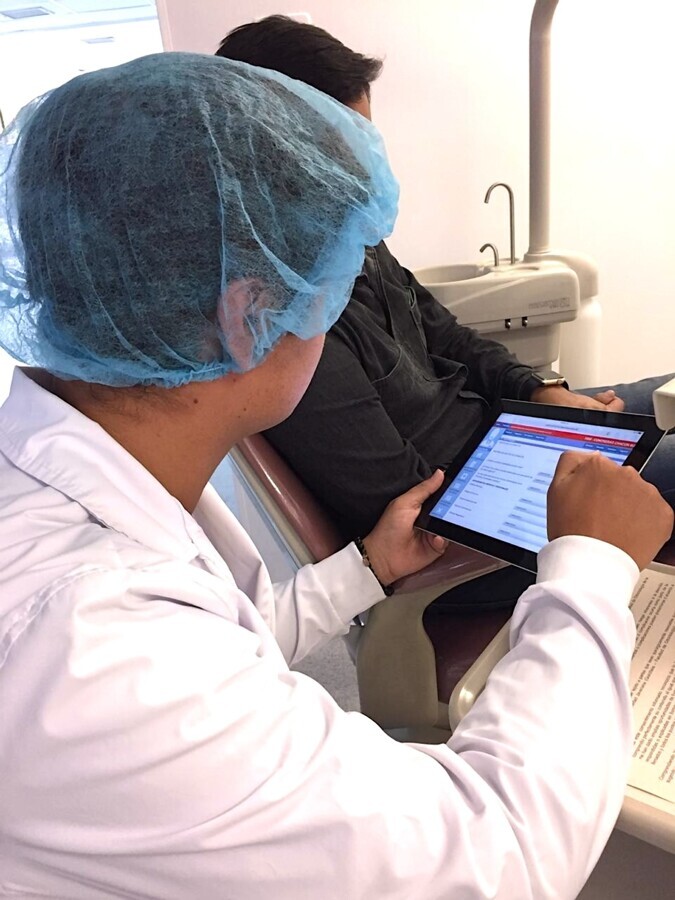 Un estudiante consulta el expediente de un paciente en un iPad equipado con el sistema SmileSoftware.