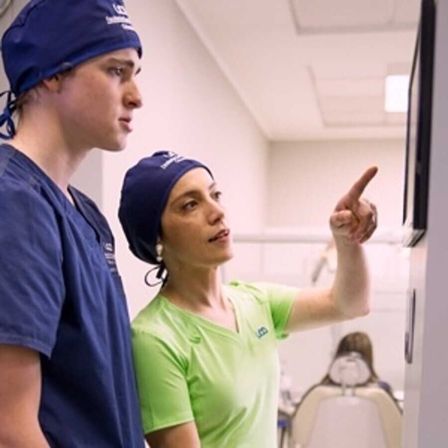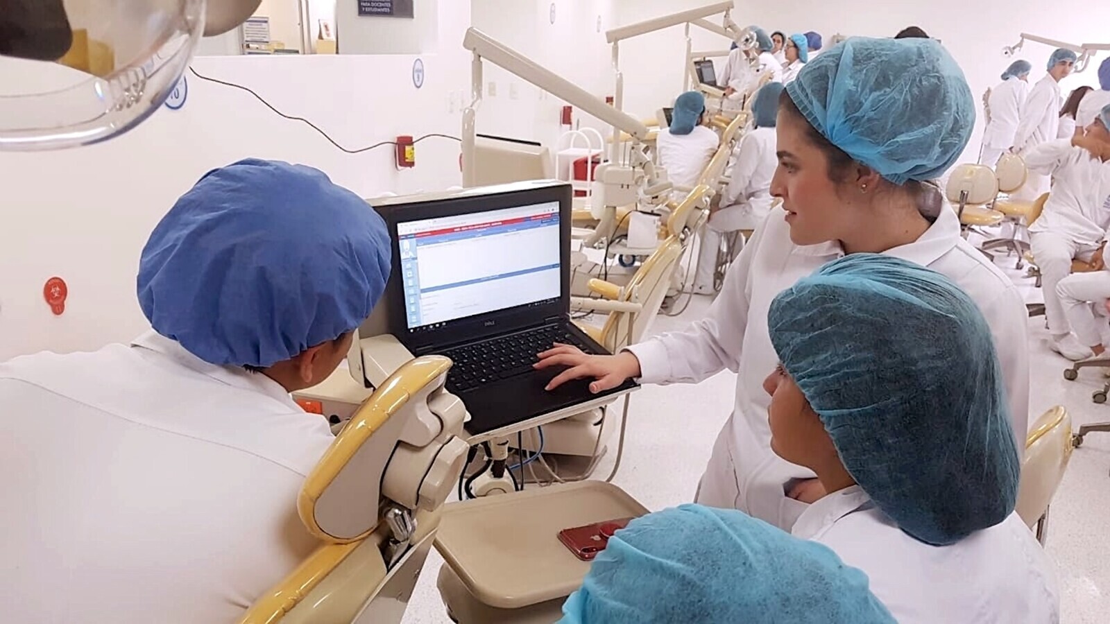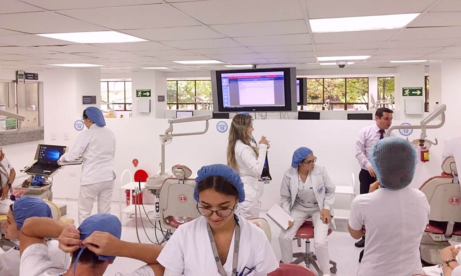 Una pantalla en una clínica universitaria domina la sala donde los estudiantes hacen prácticas supervisados por un profesor.