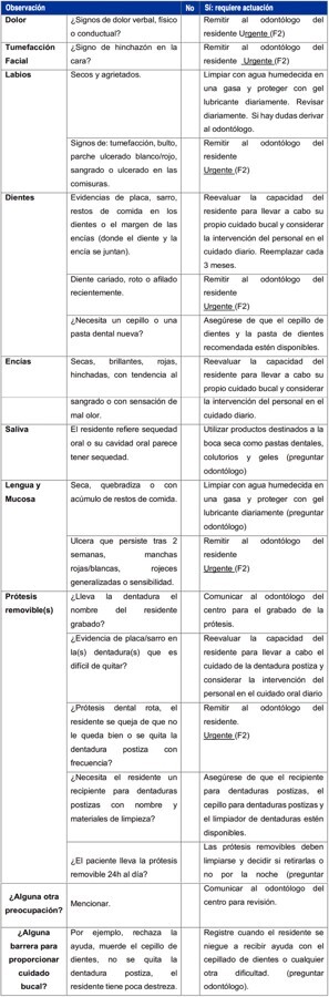 Cuando se realiza el ingreso de un nuevo residente a una institución se debe hacer una evaluación inicial de la salud bucal para poder establecer si necesita atención dental urgente o no. Esta primera valoración debe cuantificar el riesgo de mantener o no una correcta salud oral. Se pueden plantear diferentes niveles de valoración12,13: