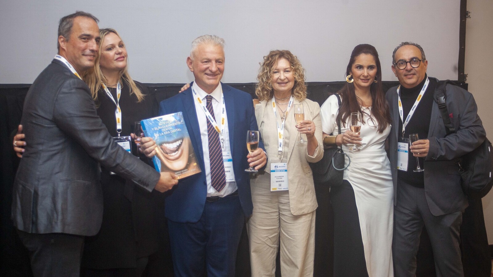 Los autores del libro "Estética y blanqueamiento dental en la era digital", Sergio Kohen, Pablo Agustín Varas y Enrique Jadad con su esposas durante la presentación del volumen.