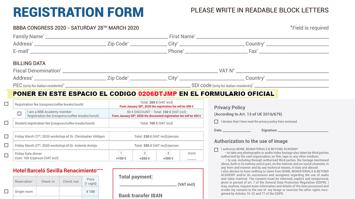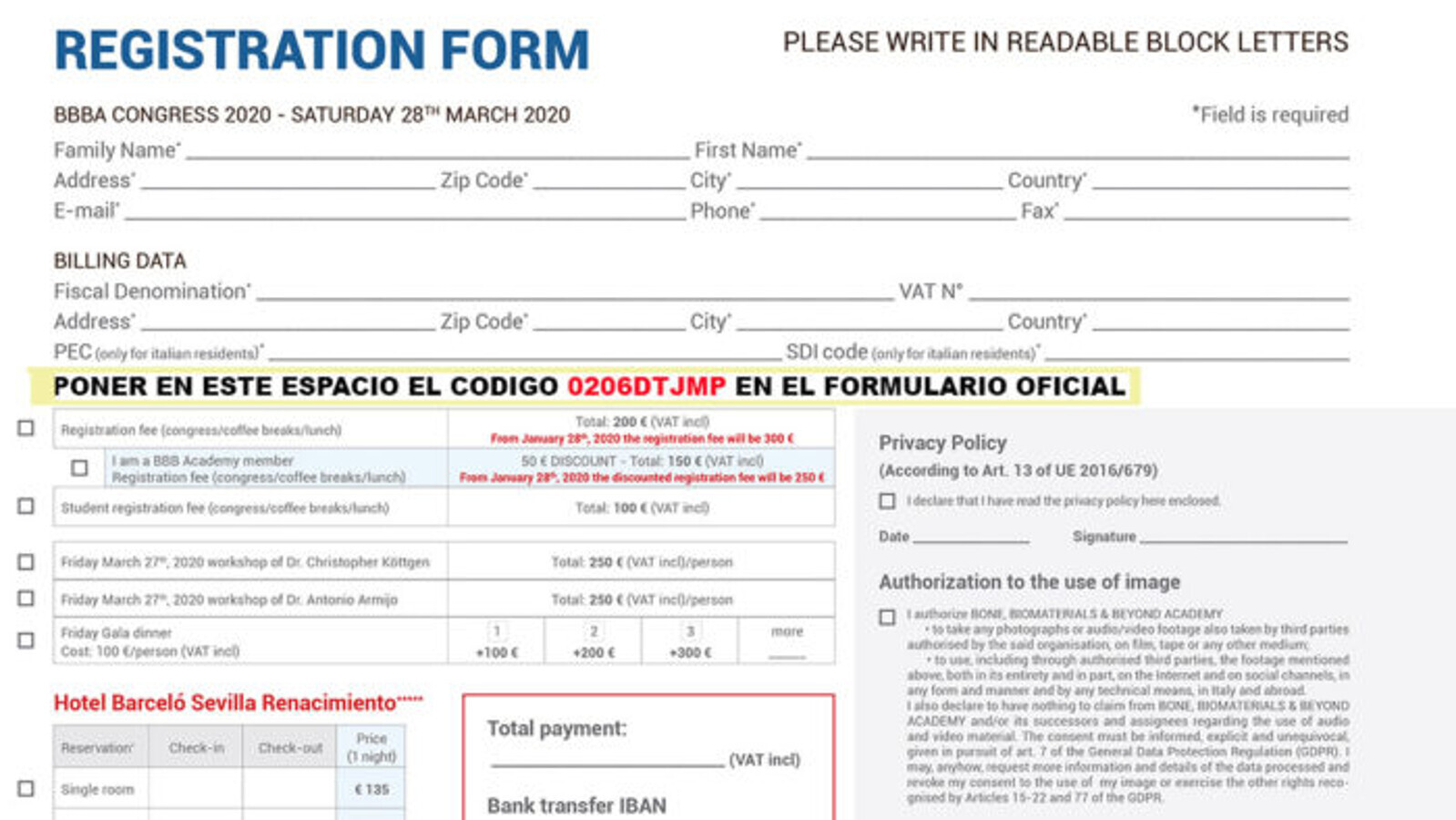Copie el código de Dental Tribune 0206DTJMP y péguelo donde se indica en el formulario oficial que está en www.bbb.academy/Documenti/iscrizione_BBB_seville2020.pdf para participar en un sorteo para latinoamericanos que le un descuento de $50 USD del precio de la inscripción. Una vez complete el formulario con sus datos, envíelo a:bbb2020@tueorservizi.it