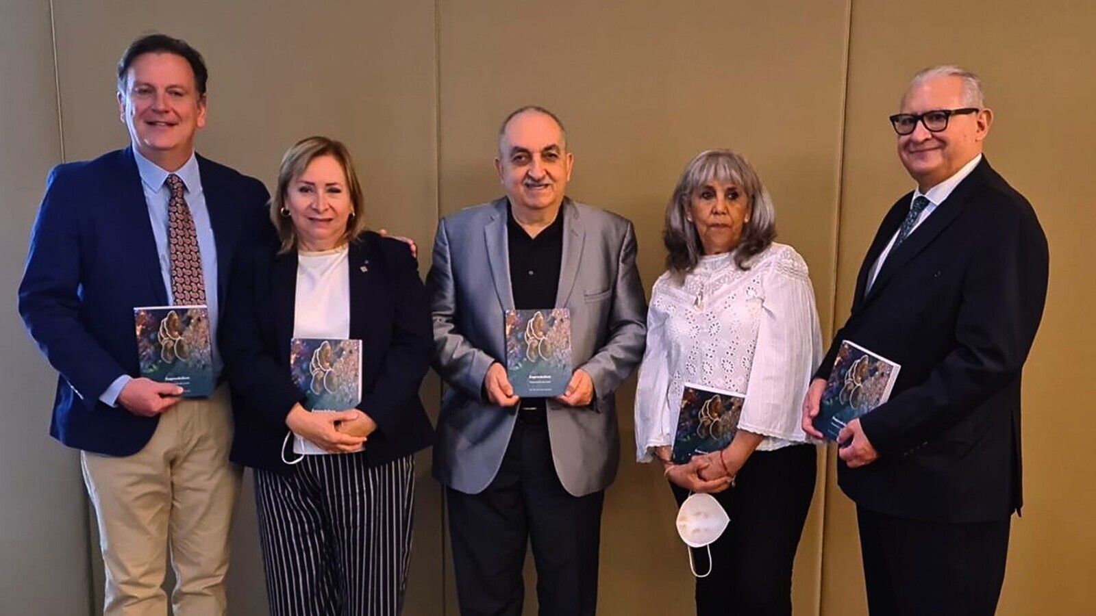 Alejandro James, Laura Díaz, Víctor Guerrero, Elba Rosa Leyva y Armando Hernández sostienen la primera edición de “Testimonios de vida y pasión”, libro del Dr. Guerrero en el que muchos profesionales de la odontología latinoamericana narran sus vidas, el cual se puede descargar gratuitamente (hacer clic en la imagen).