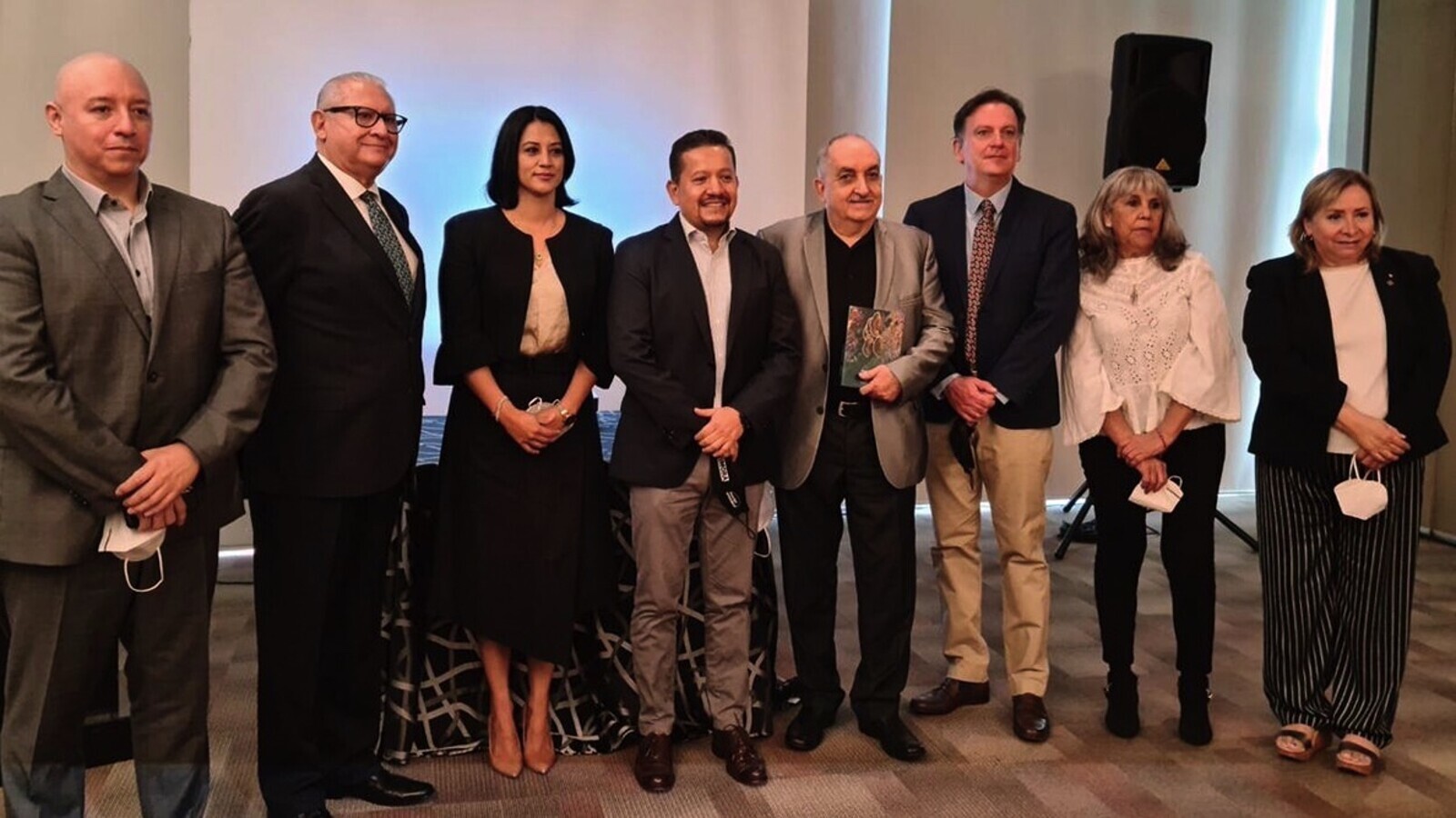 Personalidades de la odontología mexicana presentes en el evento, de izquierda a derecha, Daniel Nava, Armando Hernández, Laura Acosta Torres, David Hidalgo, Víctor Guerrero, Alejandro James, Elba Rosa Leyva y Laura Díaz.