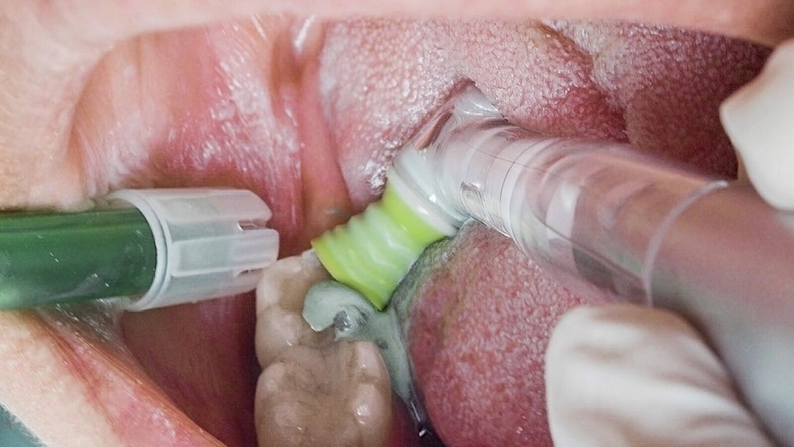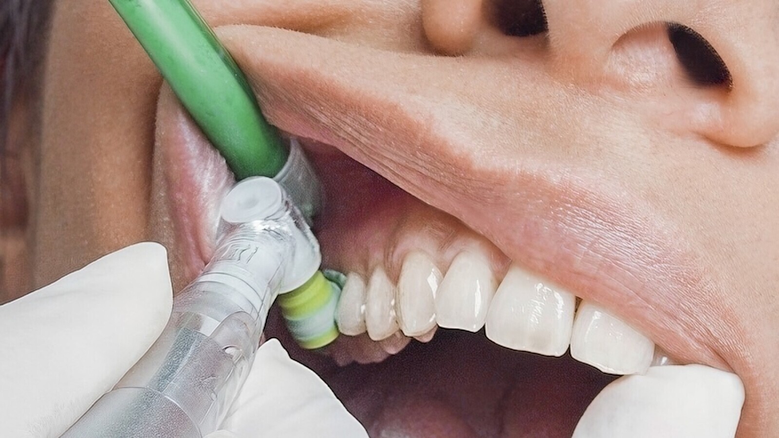 Un sistema profesional como el de la imagen alcanza los espacios interdentales, mientras que las boquillas limpian al mismo tiempo los dientes adyacentes y evitan las salpicaduras de pasta. (Foto: W&H)