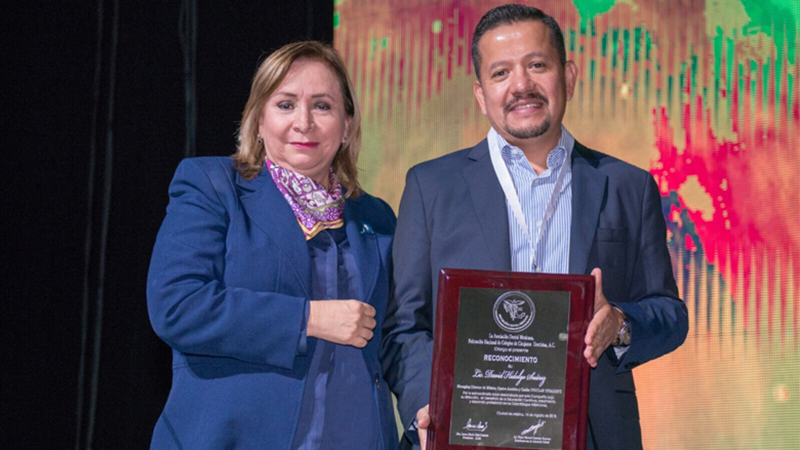 El Director General de Ivoclar Vivadent México, David Hidalgo, entrega una placa a la Dra. Laura Díaz Guzmán, Presidente de ADM, en reconocimiento a su labor por la odontología.