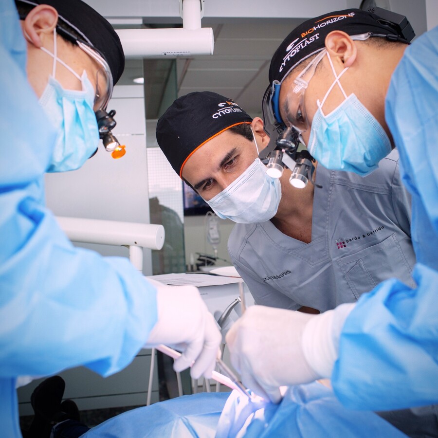 El experto en periodoncia e implantes peruano, en el centro de la imagen, supervisa un procedimiento hands-on.