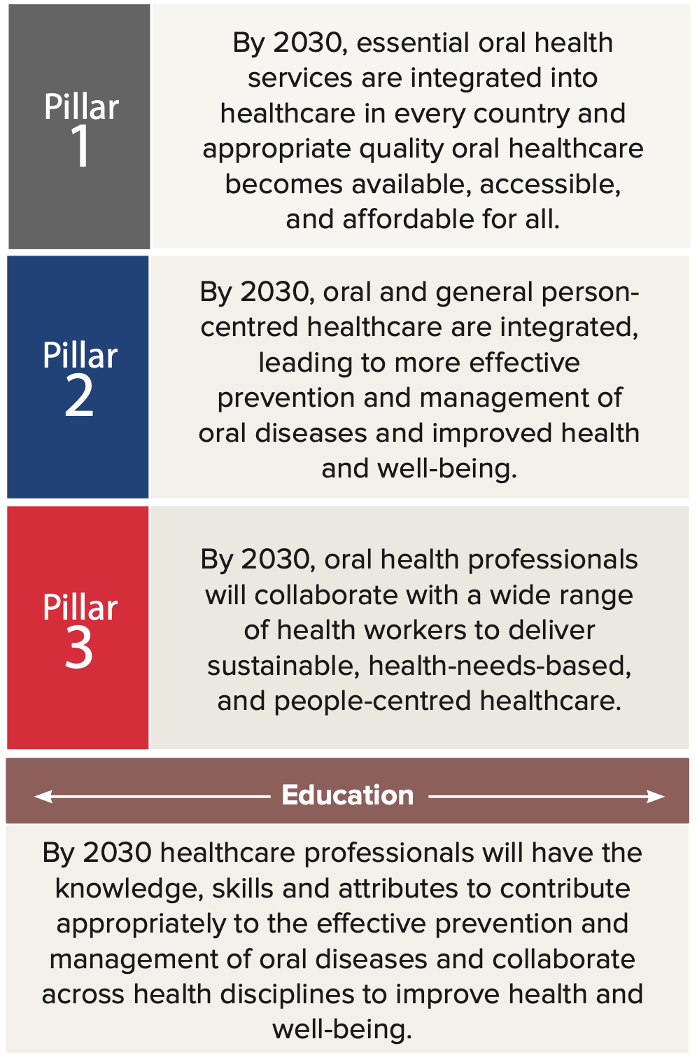 Tres pilares, cada uno con un objetivo principal, representan una estrategia para la educación que creará una profesión receptiva y resiliente con el conocimiento y las habilidades para liderar reformas de sistemas. Según la FDI, la educación y la formación en salud pública permitirán a los profesionales sanitarios contribuir de forma más eficaz a la prevención de las enfermedades bucodentales en toda la población. También les permitirá desempeñar un papel central en el tratamiento de posibles emergencias de salud pública futuras similares a la reciente pandemia de COVID-19.