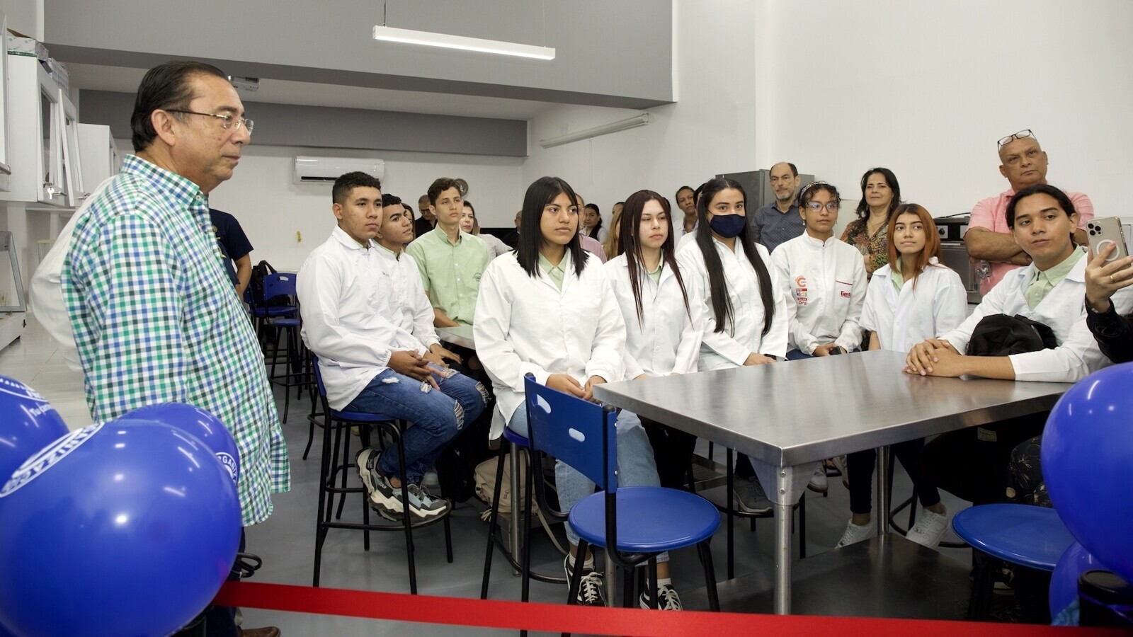 Directivos y profesores de Centro Inca en uno de los laboratorios de la institución.