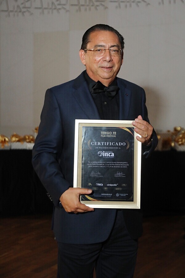 El Rector de Centro Inca, Jairo Rodelo, recibe un reconocimiento por su larga trayectoria en la enseñanza, en este caso por haber sido sede del Film Festival Barranquilla.