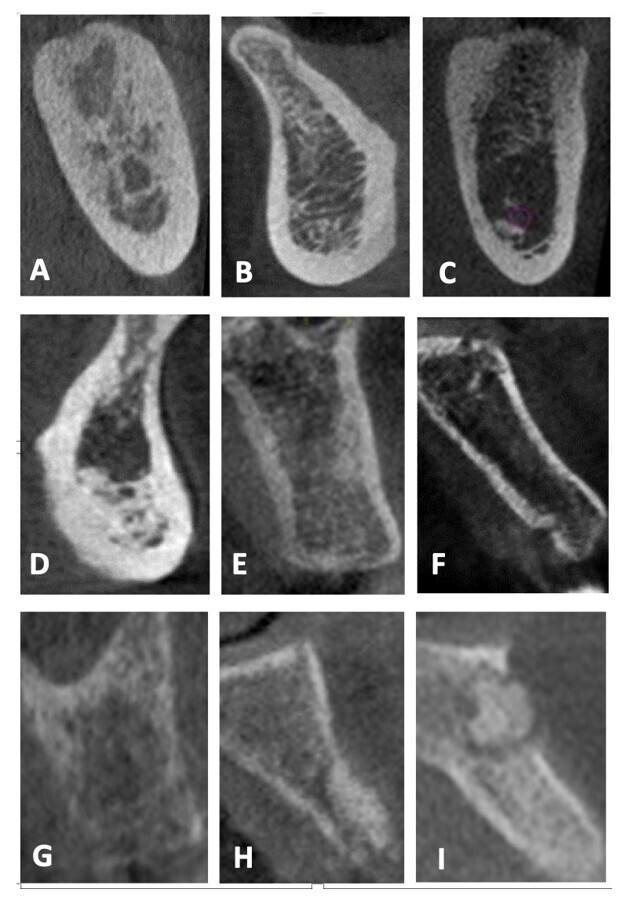 Figura 4. Calidad ósea según la clasificación de Lekholm y Zarb modificada. A: Tipo I, B: Tipo II-A, C: Tipo II-B, D: Tipo II-C, E: Tipo III-A, F: Tipo III-B, G: Tipo IV, H: Tipo V, I: Tipo VI.