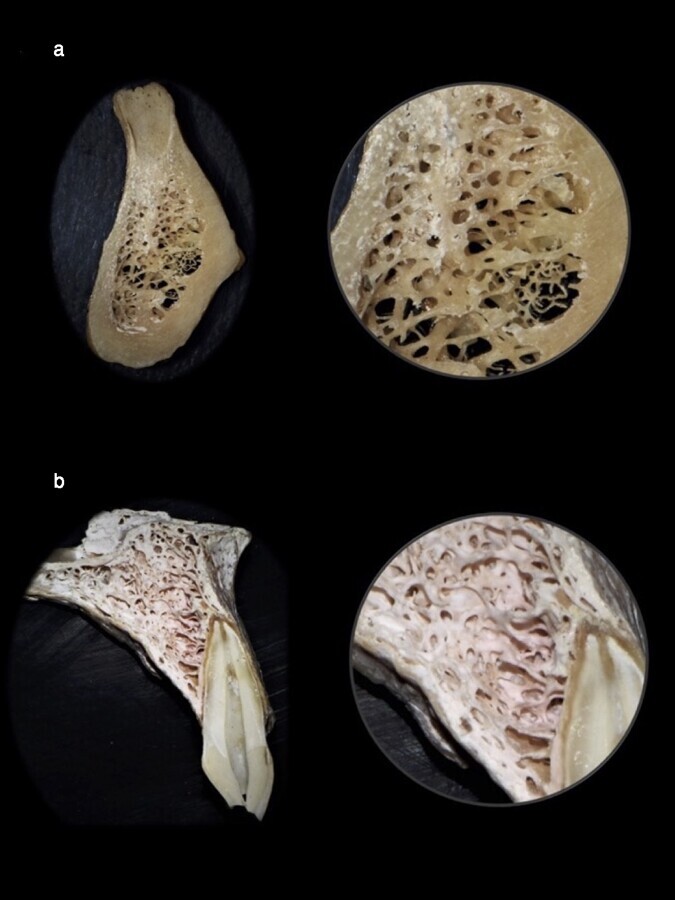 Figura 3. Sector anteroinferior donde se observa una cortical gruesa y un hueso esponjoso con espacios medulares pequeños y trabéculas finas, medianas y gruesas (a). Sector anterosuperior donde se observa una cortical delgada y un hueso esponjoso con espacios medulares pequeños y trabéculas medianas a gruesas (b).