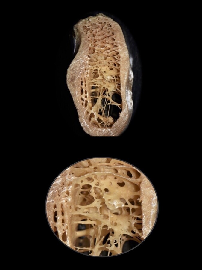 Figura 1. Sector postero-inferior de la mandíbula donde se aprecia una cortical gruesa y hueso esponjoso con espacios medulares amplios (arriba) y trabéculas bastante finas (debajo), muchas veces del espesor de un cabello (0,025 mm).