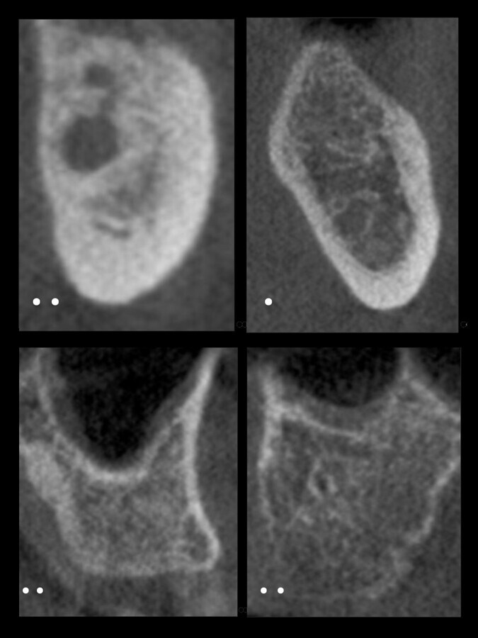 Las clasificaciones tradicionales asocian la calidad ósea con ciertos sectores en los maxilares. Por ejemplo, se dice que el sector anteroinferior de la mandíbula suele presentarse hueso tipo I y en el posteroinferior tipo II. La variante en la zona posterioinferior mandibular se debe a que, a pesar de tener una buena cortical ósea y cantidad de hueso esponjoso, la dimensión de los espacios medulares es muy amplia y el grosor de las trabéculas tan finas como el espesor de un cabello11(Figura 3).