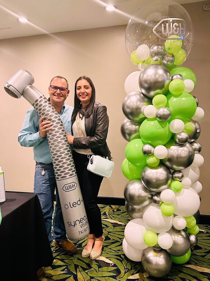 Dos odontólogos posan junto a una reproducción del contra-ángulo de alta velocidad Synea Power Edition de W&H, que permite procesar y remover fácilmente materiales cerámicos como el zirconio, por lo que son la solución ideal para procedimientos como la extracción de coronas y puentes.