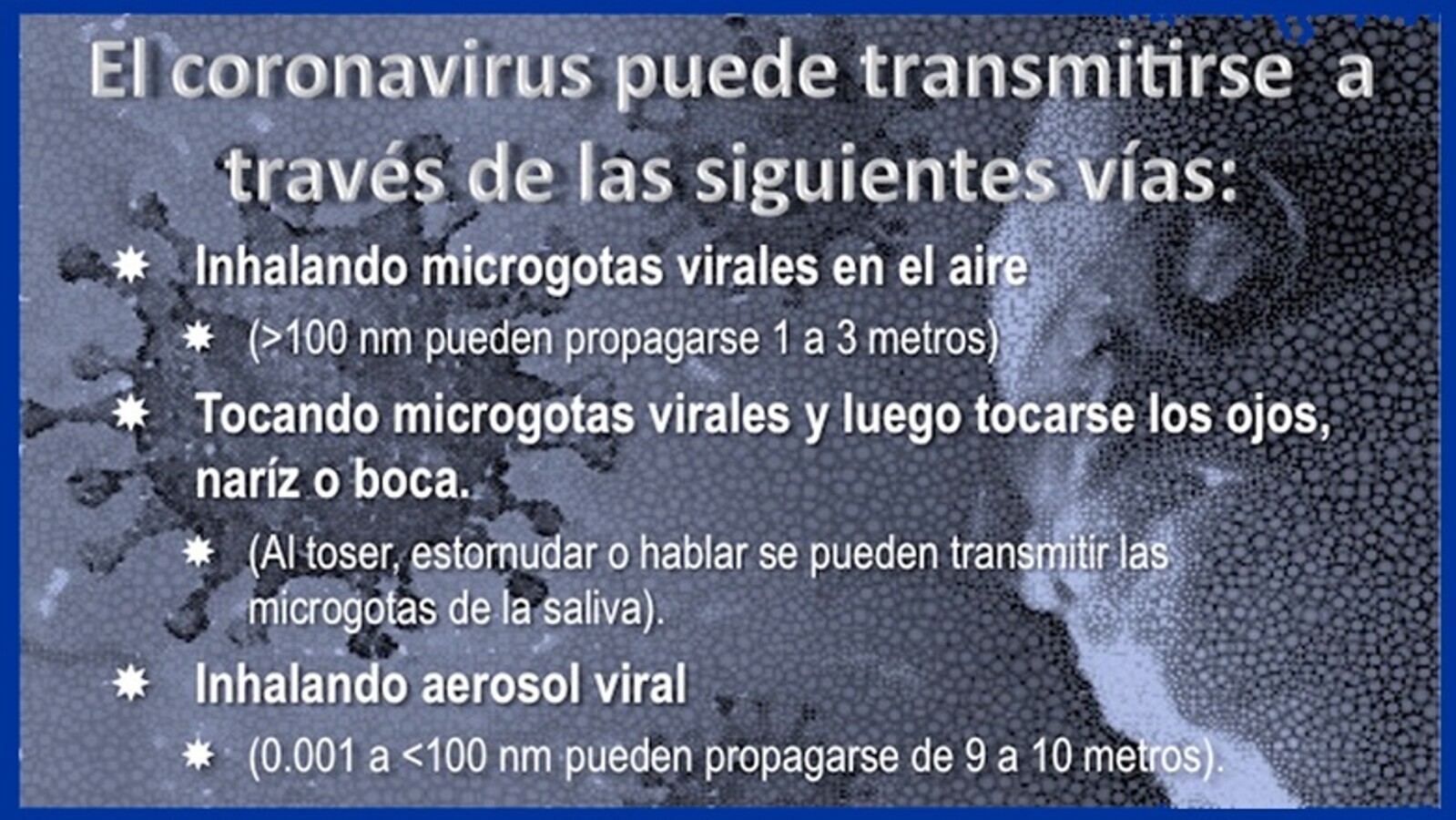 El coronavirus no está suspendido en el aire, el virus es respiratorio y las gotitas de Flügge pueden caer o llegar a nuestras manos y pasar a los ojos, nariz y boca. Los estudios realizados señalan que el virus SARS-CoV2 se transmite principalmente por contacto con gotitas respiratorias o microgotas de Flügge, más que por el aire. Karl Georg Friedrich Wilhelm Flügge en la década de 1890 demostró que las gotitas que se expulsan de forma inadvertida por la boca y nariz al realizar acciones como toser o estornudar, incluso al hablar en voz baja o simplemente al respirar, pueden transportar diversos microbios patógenos, tales como bacterias y virus. La mayoría de las microgotas provienen de la saliva, y pueden caer sobre objetos y superficies que rodean a la persona, y de esta forma otras personas pueden contaminarse del virus si tocan estos objetos o superficies, y con las manos contaminadas al tocarse los ojos, la nariz o la boca pueden darle entrada al virus a todo el sistema orgánico.