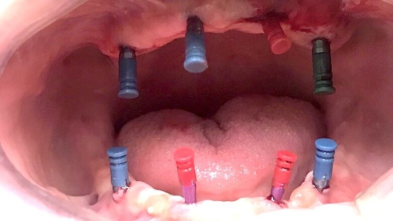 La Figura 4 muestra los 8 implantes colocados en una sola cita para realizar el procedimiento de la manera menos traumática posible, y para que el proceso de cicatrización fuera el más adecuado y causara menor inflamación del tejido con menores complicaciones preoperatorias.