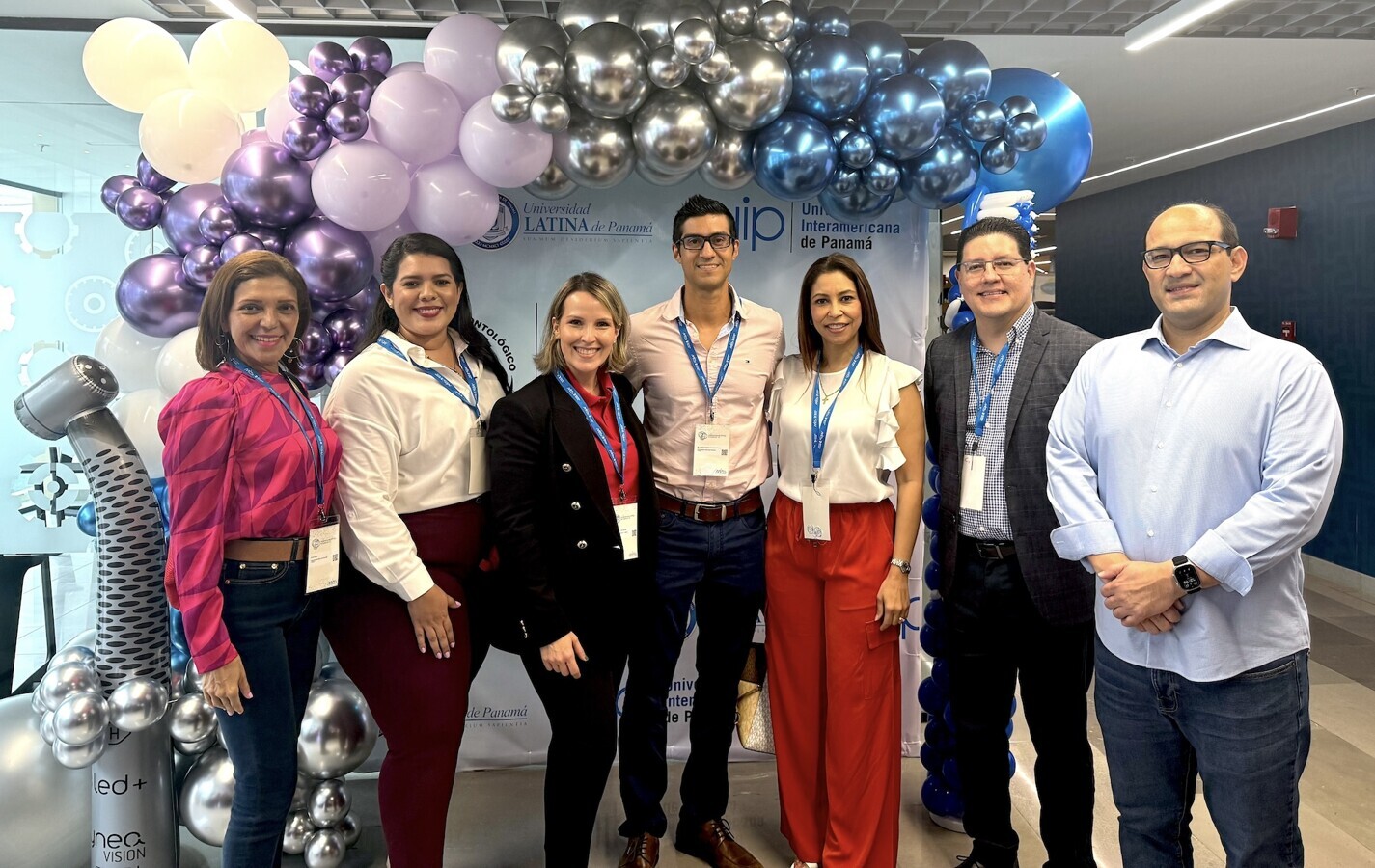 La Decana de Odontología de ULatina de Panamá con varios docentes de la institución.