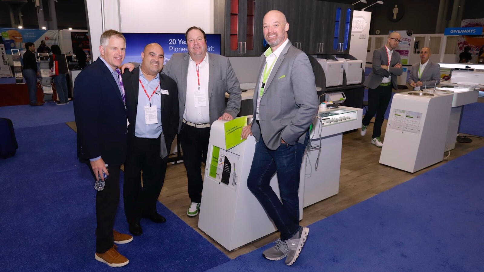 Cuatro dentistas posan satisfechos para el lente de John F. Barragán en la exposición comercial.