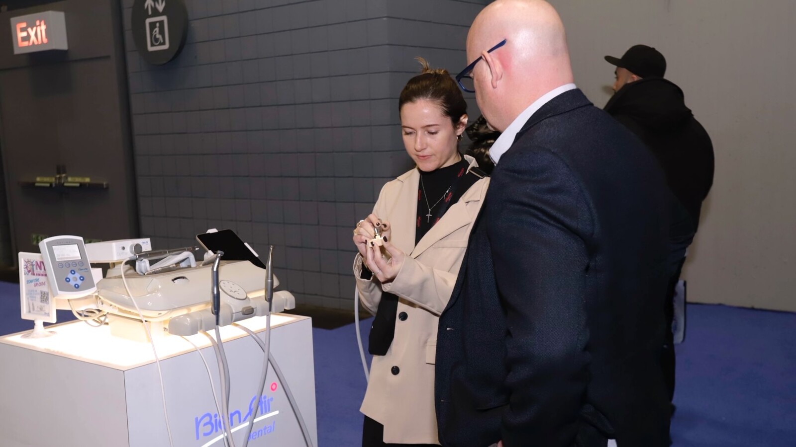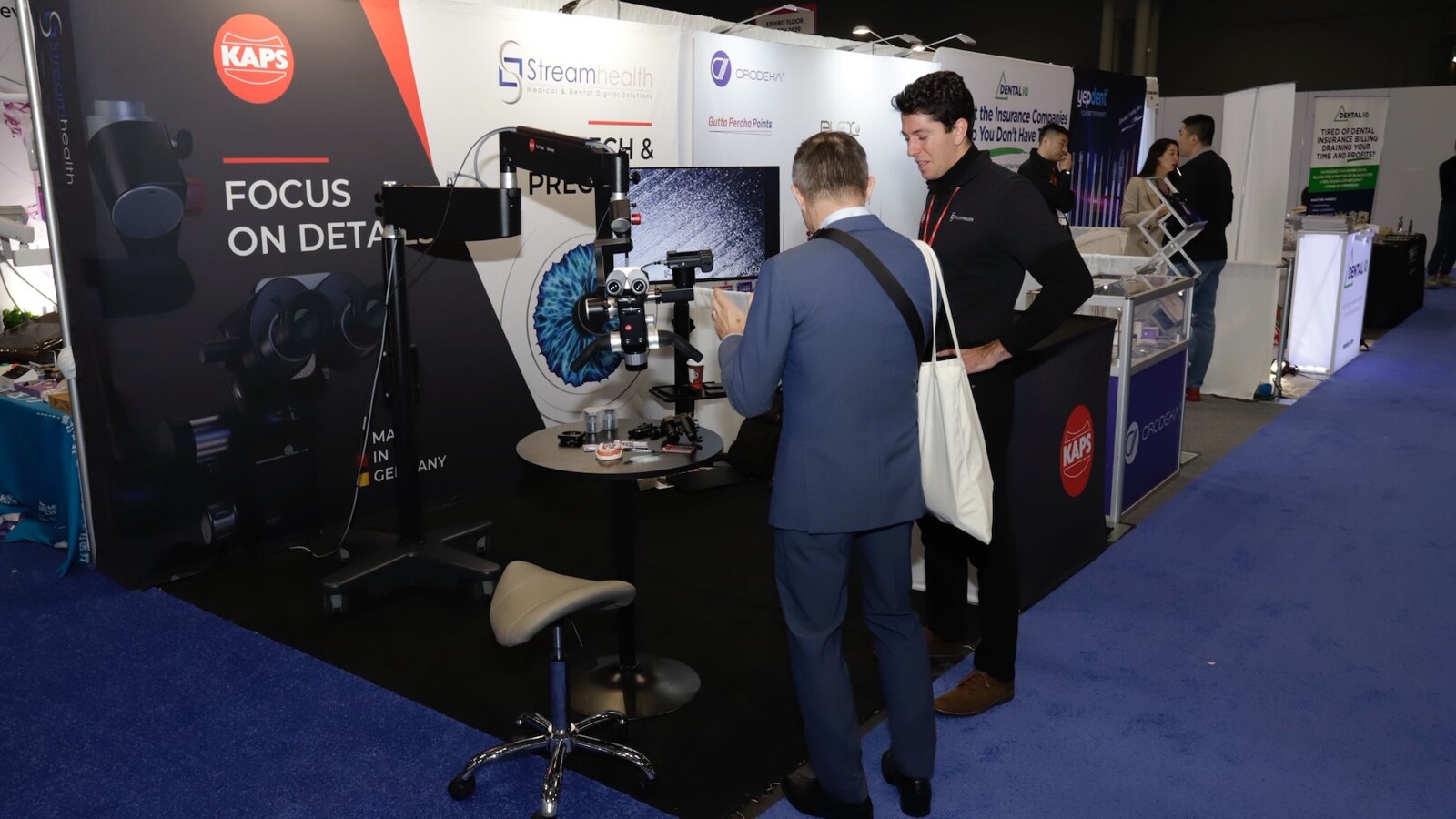 El Dr. Enrique Jadad enseña a una odontóloga cómo colocar un escáner intraoral durante una de sus presentaciones en GNYDM 2025.