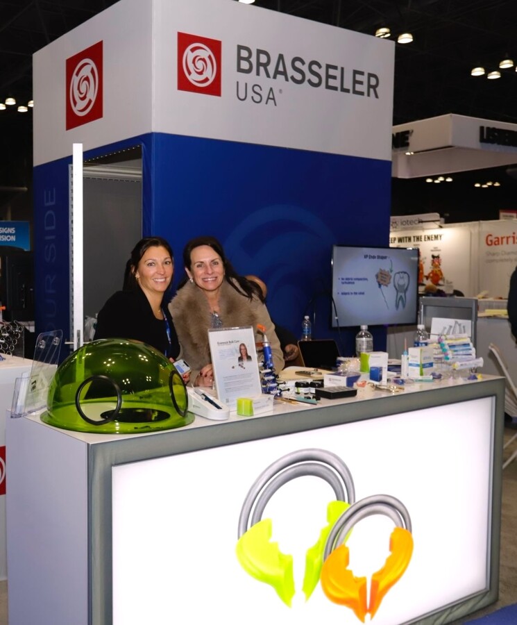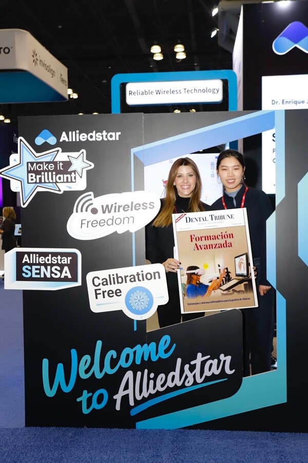 Dos asistentes a la exposición muestran varias portadas de Dental Tribune en el stand de la empresa Alliedstar, que fabrica escáneres intraorales. (toque en la imagen para más información).