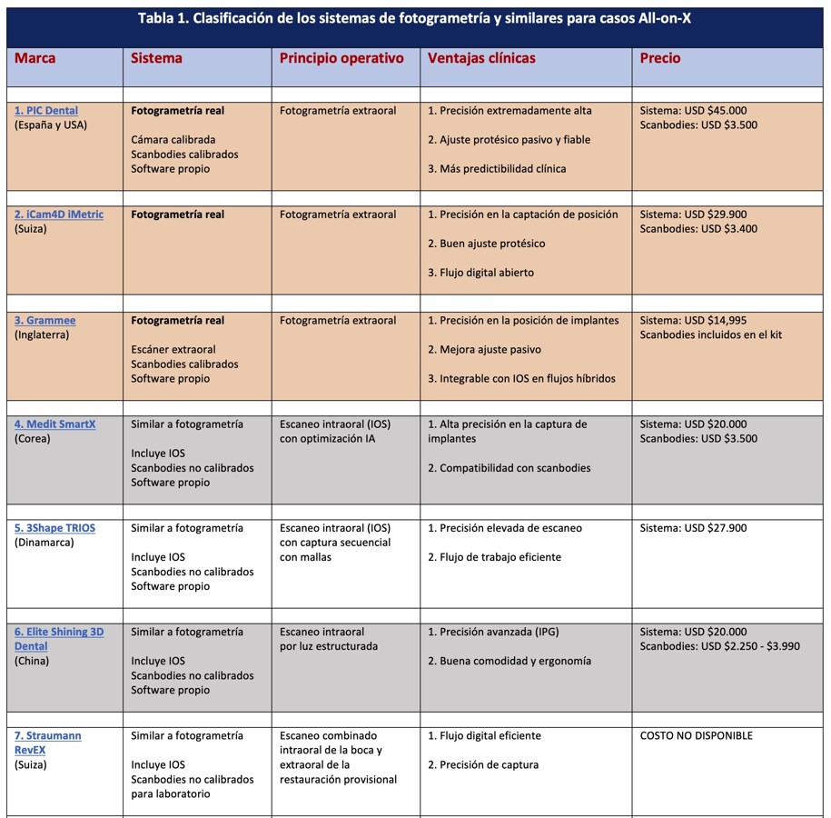 Tabla 1. La fotogrametría utiliza cámaras extraorales y scanbodies calibrados que le confieren mayor precisión en casos All-on-X que los sistemas basados en IOS y scanbodies no calibrados.
