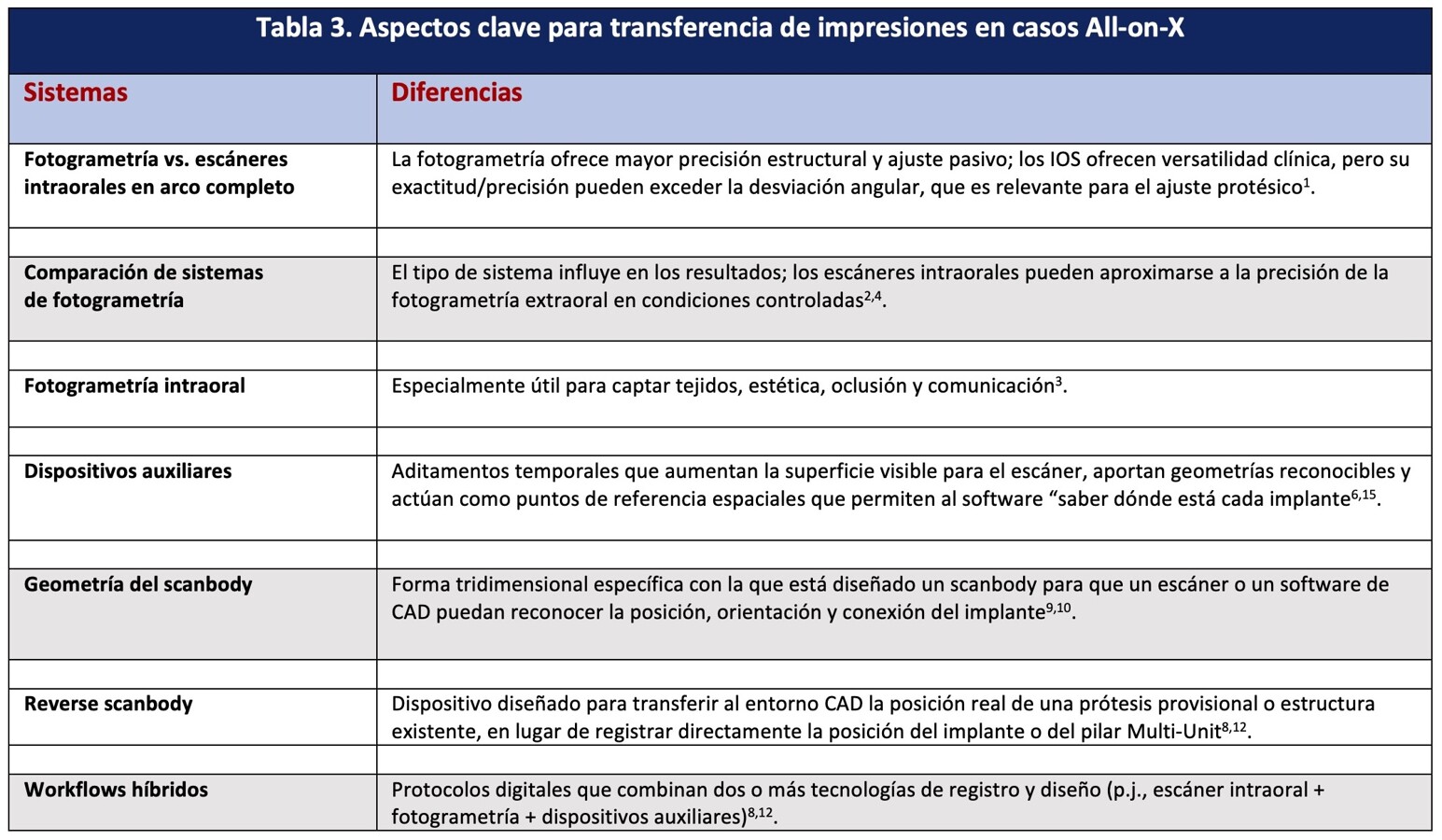 Tabla 3. Existen múltiples sistemas, dispositivos auxiliares y geometrías de scanbodies para casos All-on-X.