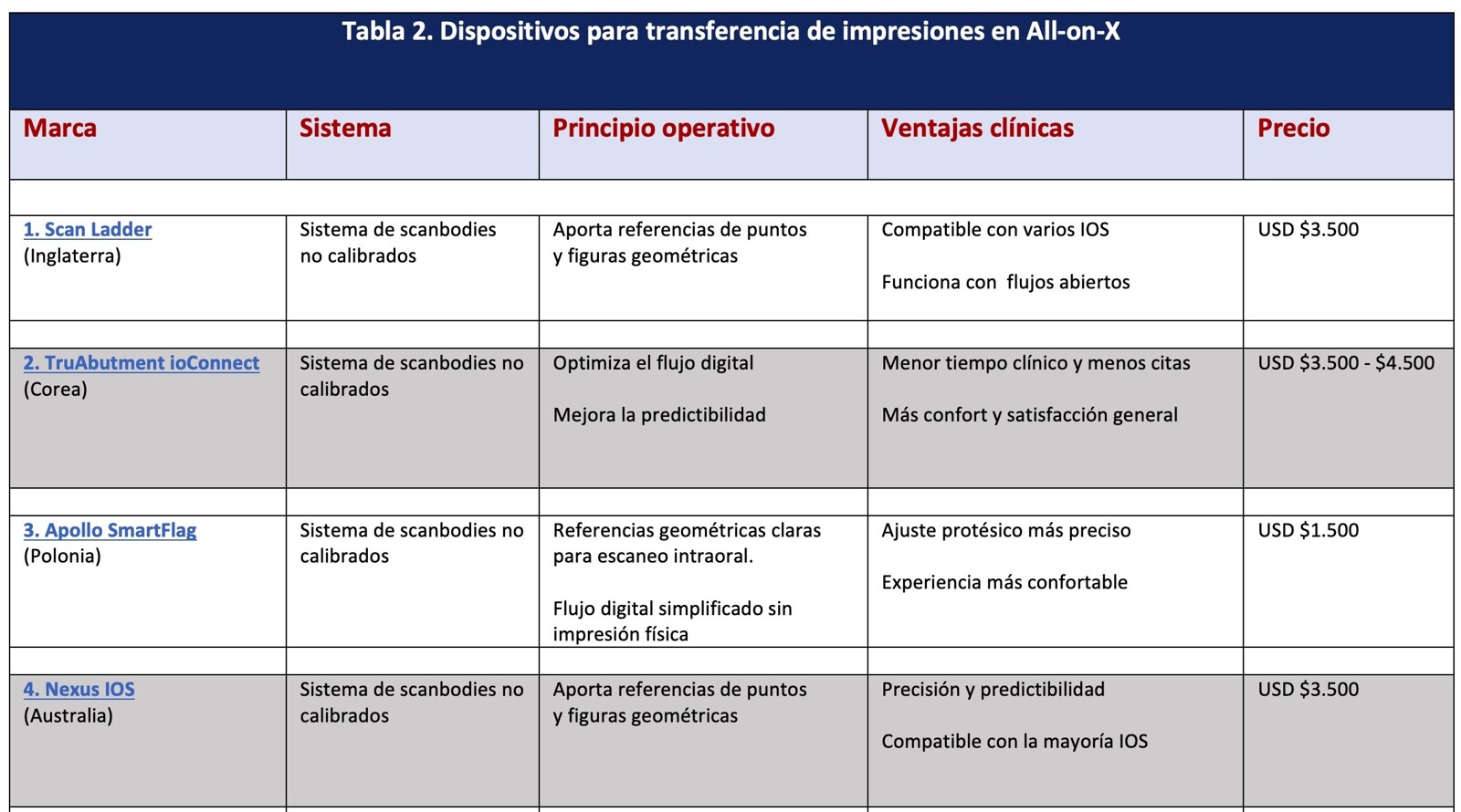 Tabla 2. Estos dispositivos son scanbodies que funcionan como una alternativa a los sistemas de fotogrametría en casos All-on-X.