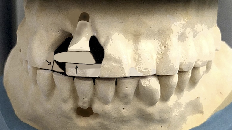 Figura 2. Dispositivo de sujeción de un diente en un modelo de un maxilar superior de un individuo de Tebas (Egipto) de la 26 Dinastía, 600 a.C. (Foto: Holger Goetzendorff, 2018)