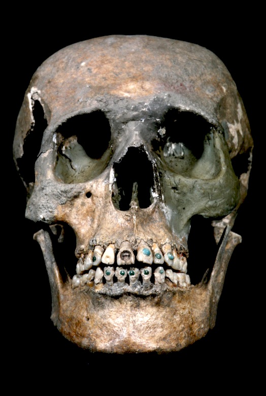 Figura 4. Cráneo maya con incrustaciones de jade y turquesa que muestra la pericia de las decoraciones dentales en Mesoamérica. (Foto: Entierro 212, Chiapa de Corzo, Chiapas, México, 861-871, Instituto Nacional de Antropología e Historia INAH, 1962)