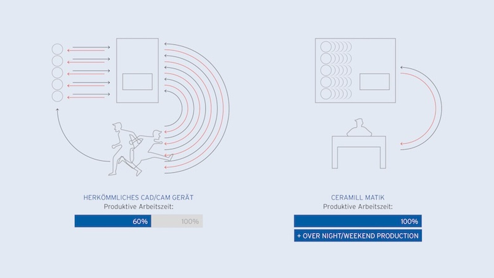 Imagen 3. Flujo de trabajo en el laboratorio con un aparato CAD/CAM convencional comparado con un flujo de trabajo en el laboratorio con la Ceramill Matik.