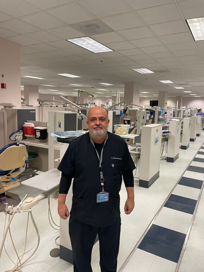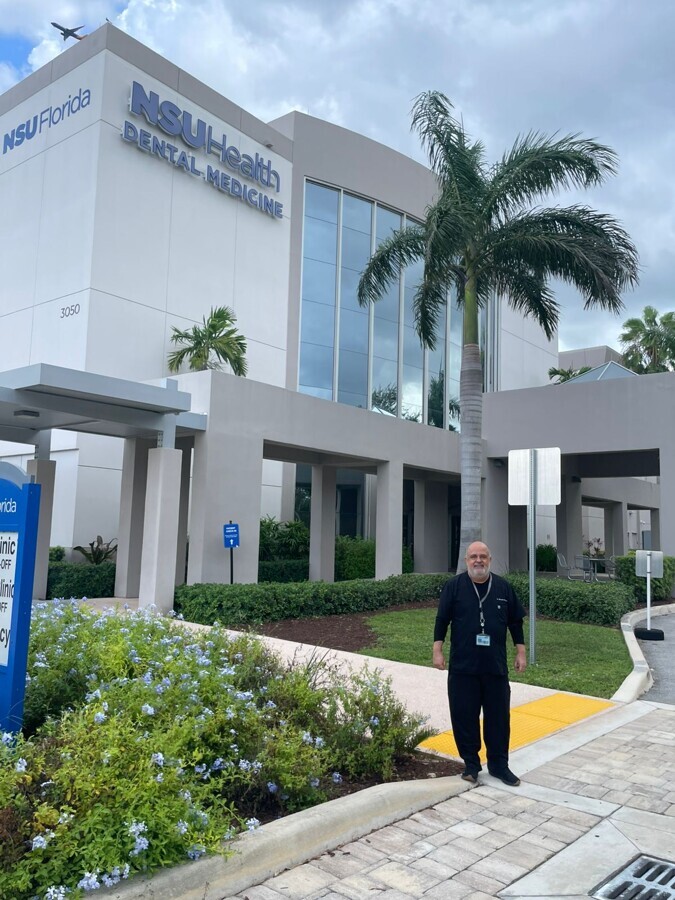 El Dr. Mauricio Guerrero a la entrada de la Facultad de Odontología de NSU, universidad situada en Davie, Florida (USA), a unos 70 kilómetros al norte de Miami.