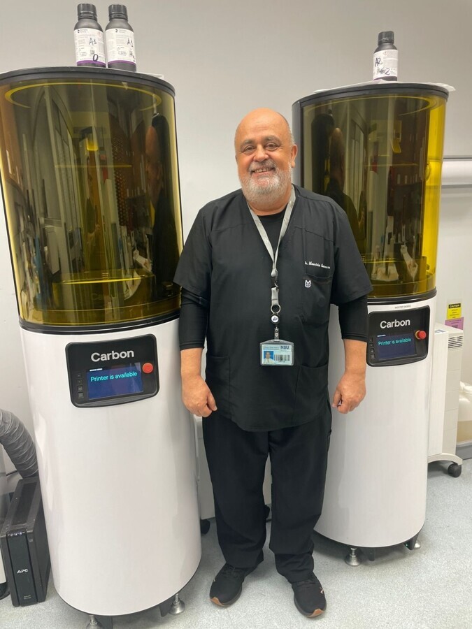 El Dr. Mauricio Guerrero junto a las impresoras 3D Carbon en NSU, las cuales permiten imprimir todo tipo de productos, desde alineadores dentales a zapatillas de tenis a medida.