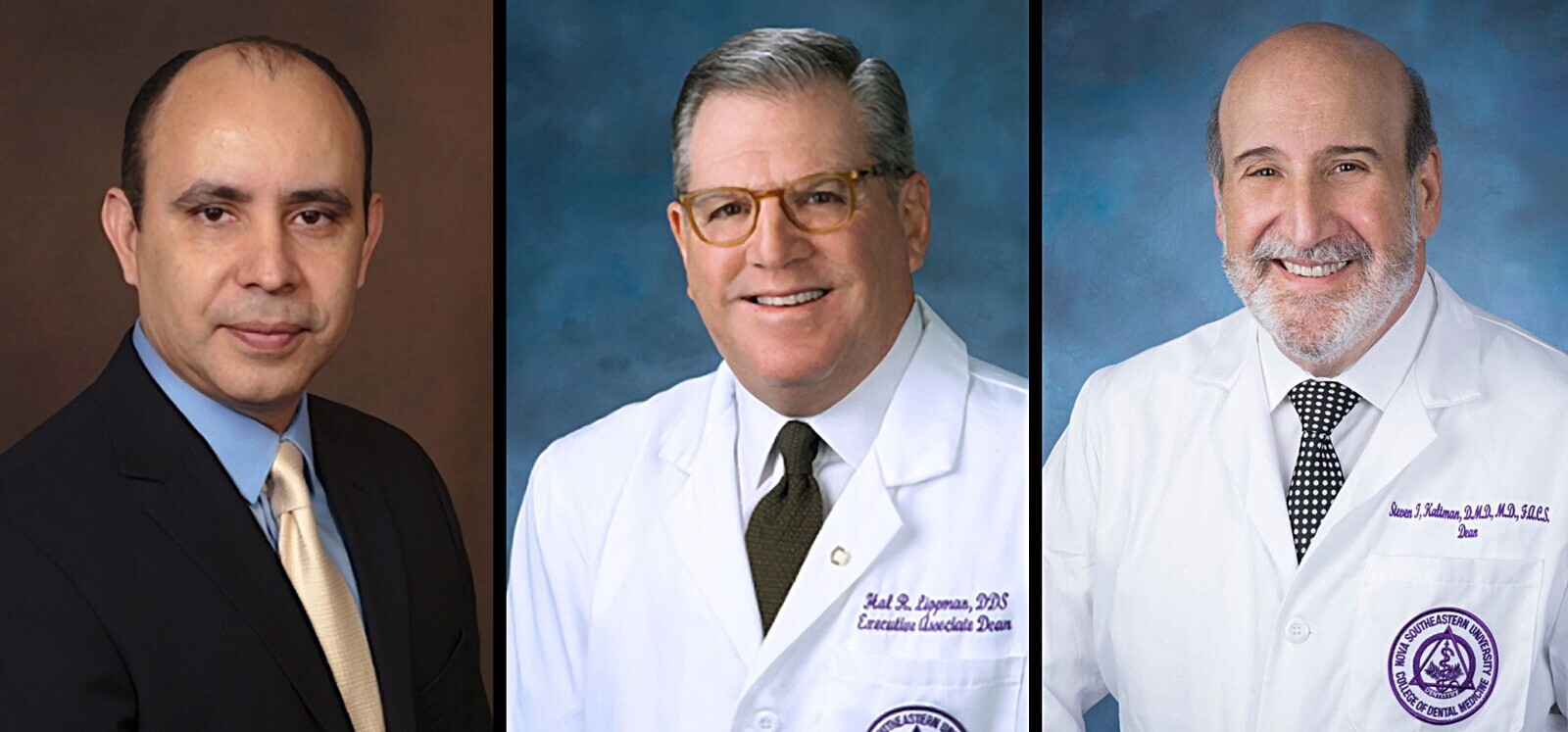 Los decanos que participan en el programa digital del Colegio de Medicina Dental de NSU son, desde la izquierda, Rafael Castellón, Decano Asociado de Clínicas; Hal Lippman, Decano Ejecutivo Asociado; y Steven Kaltman, Decano del Colegio de Medicina Dental de la Universidad Nova Southeastern.