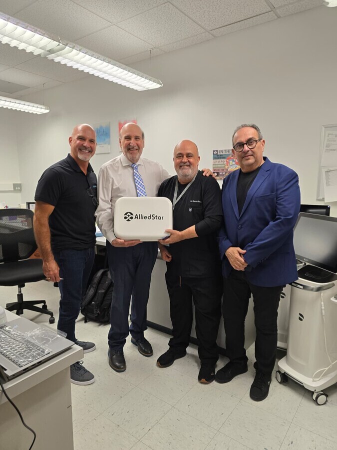 Patrick Stochkirsh, de AlliedStar (izquierda), realizó una presentación de los productos de su compañía ante el Decado de Odontología de NSU, Dr. Steven Kaltman, y los doctores Mauricio Guerrero y Enrique Jadad.
