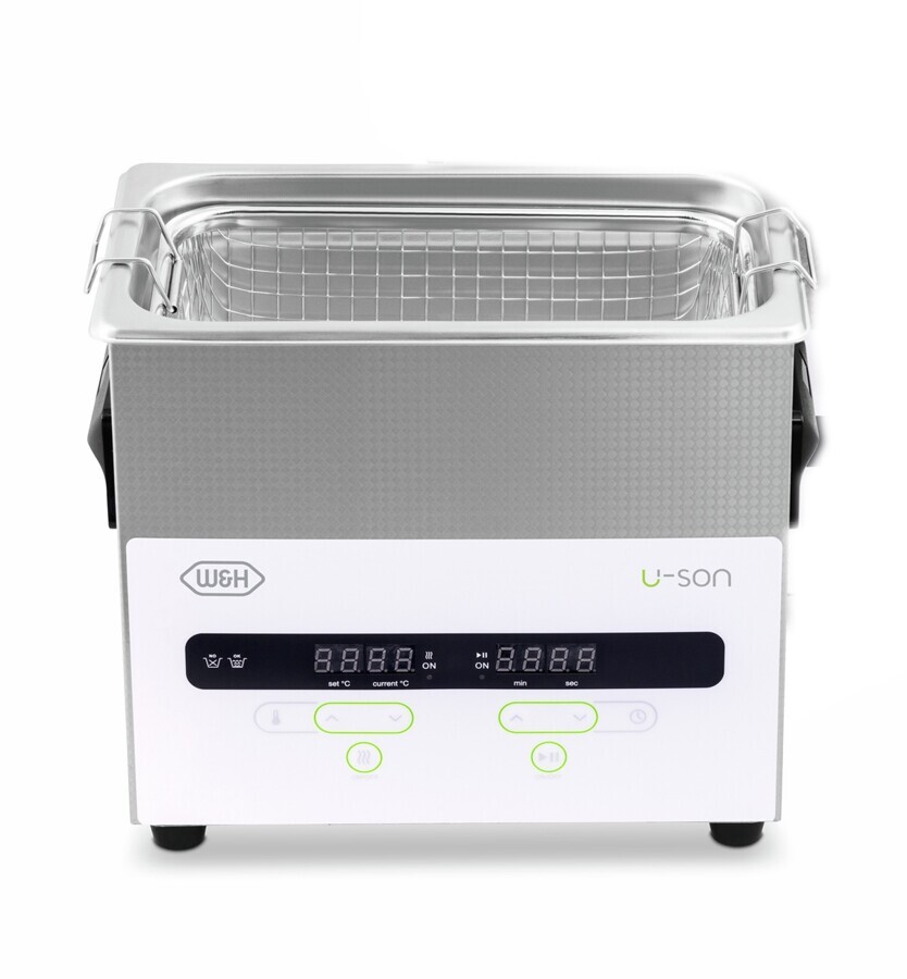 El dispositivo ultrasónico U-Son es totalmente fiable y está diseñado para ofrecer un rendimiento excelente. La limpieza por ultrasonido es especialmente adecuada para instrumentos dentales pequeños, complejos y de textura fina. El procedimiento suave también prolonga la vida útil de los instrumentos. W&H recomienda utilizar el potente BePro Disinfectant I como líquido de limpieza y desinfección.