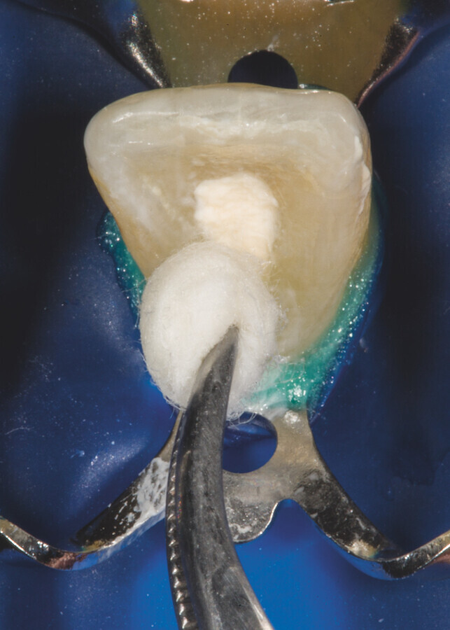 Fig. 5. Paso 5: retirar el excedente con un algodón o una gasa húmeda antes de fotopolimerizar. Foto: Enrique Jadad