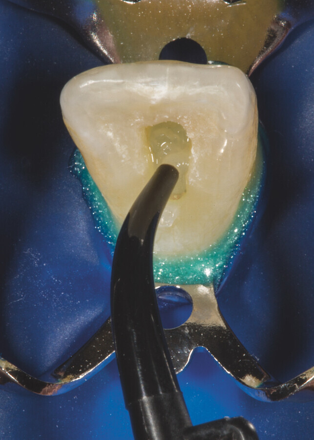 Fig. 2. Paso 2: aplicar el agente blanqueador en la cámara pulpar coronaria, dejando un espacio de 3-5 mm para alcanzar la profundidad necesaria. Foto: Enrique Jadad