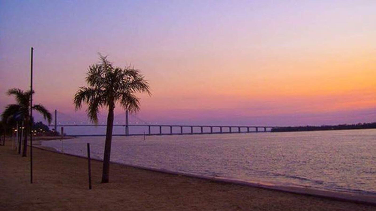 Atardecer en el imponente río Paraná (arriba) y Puente Rosario - Victoria, 55 kms sobre dicho río, que une las provincias de Santa Fe y Entre Ríos y es la mayor obra de ingeniería de la ciudad.