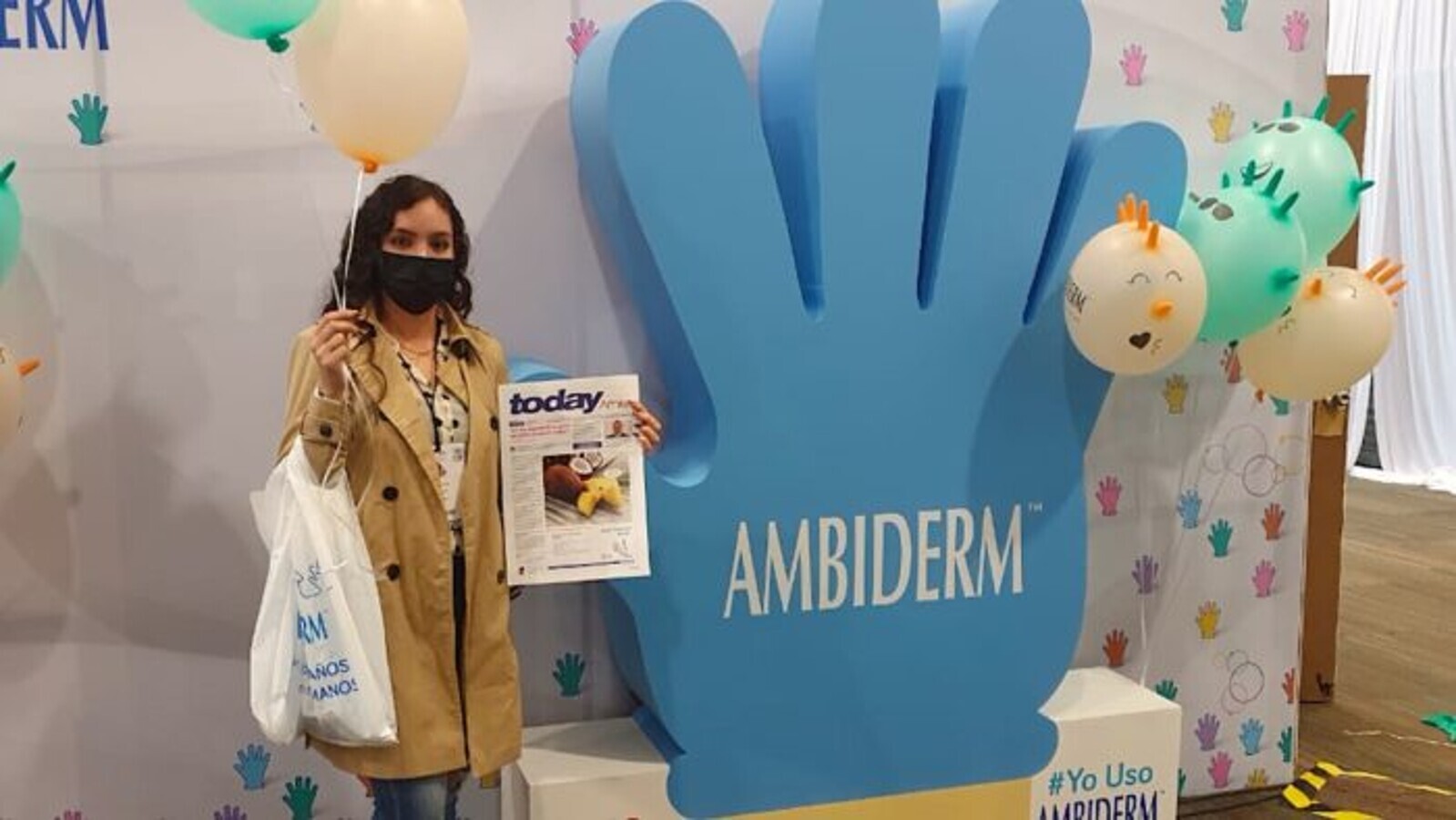 Una joven odontóloga muestra un ejemplar del periódico “today” que Dental Tribune distribuye en la 73 Expo AMIC Dental.