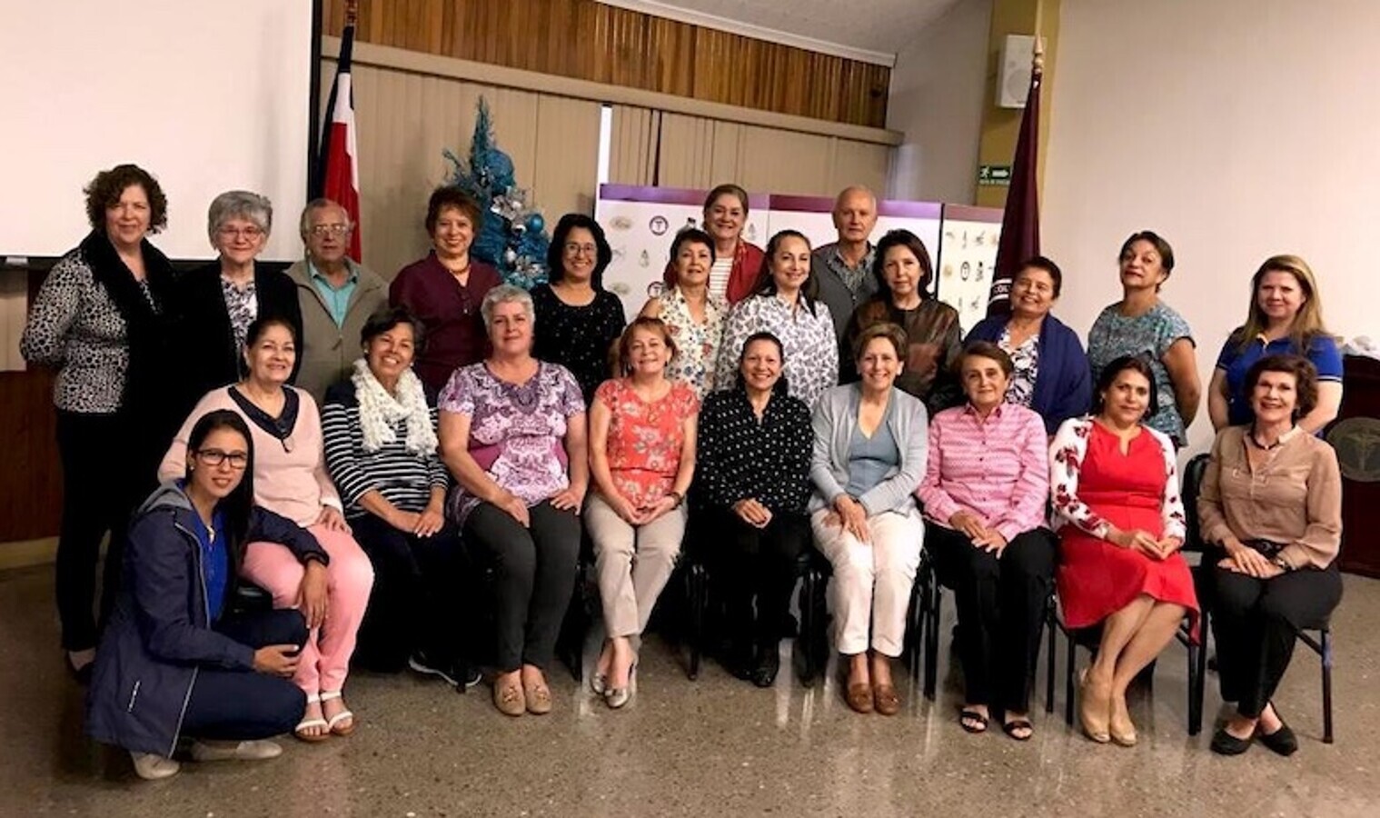 La ex Presidenta del CCDR, cuarta por la derecha en primera fila, continúa activa, colaborando con los grupos de voluntariado como “60 y más”, alianza de odontólogos mayores de 60 años que ofrece atención dental gratuita a personas de bajos recursos en Costa Rica.