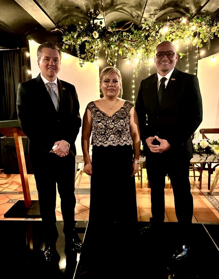De izquierda a derecha, el Dr. Sergio Curiel Torres, Presidente de la Asociación Dental Mexicana, Federación Nacional de Colegios de Cirujanos Dentistas A.C., la Dra. María Eulalia Ramírez Valdez, nueva Presidente de la Asociación Dental de León, Colegio de Cirujanos Dentistas A.C. para el período 2024-2025, y el Dr. Gustavo García López, Presidente de la Federación del Colegio de Cirujanos Dentistas de Guanajuato.