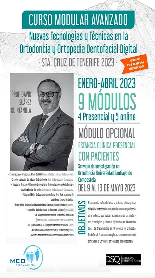 El Profesor David Suárez Quintanilla, Catedrático de Ortodoncia en la Universidad de Santiago de Compostela, impartirá un curso único sobre Nuevas Tecnologías y Técnicas en Ortodoncia y Ortopedia Dentofacial Digital de tres meses de duración en 2023 en Santa Cruz de Tenerife. El curso tiene un formato modular y parte del mismo será presencial y otra parte online.