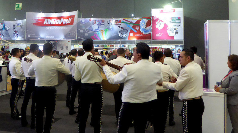 Una banda de Mariachis canta frente al stand de Ah Kim Pech en Greater ARIC Dental, la gran feria de Guadalajara.