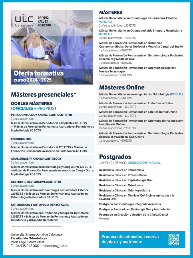 El nuevo programa de Másters de UIC-Barcelona para el año académico 2024-2025 ofrece formación de alta calidad y gran versatilidad, mediante cursos presenciales y online de diversas duraciones en prácticamente todas las áreas de la Odontología.