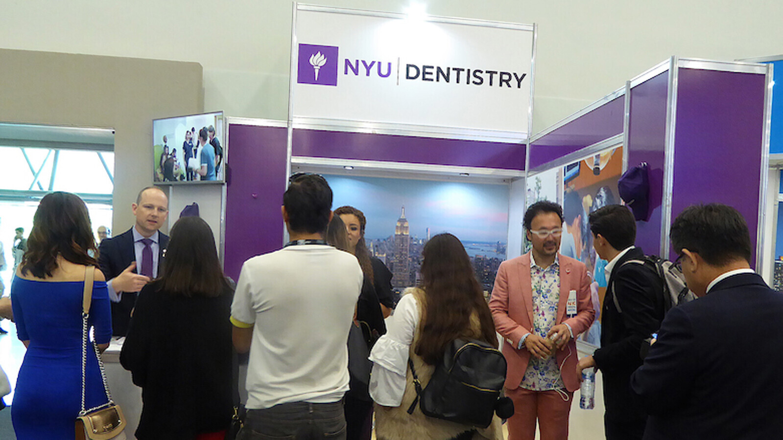 Derek Kelly, Director de Programas Internacionales de NYU, y Takanori Suzuki, en el stand de NYU en Greater ARIC Dental, en Guadalajara.