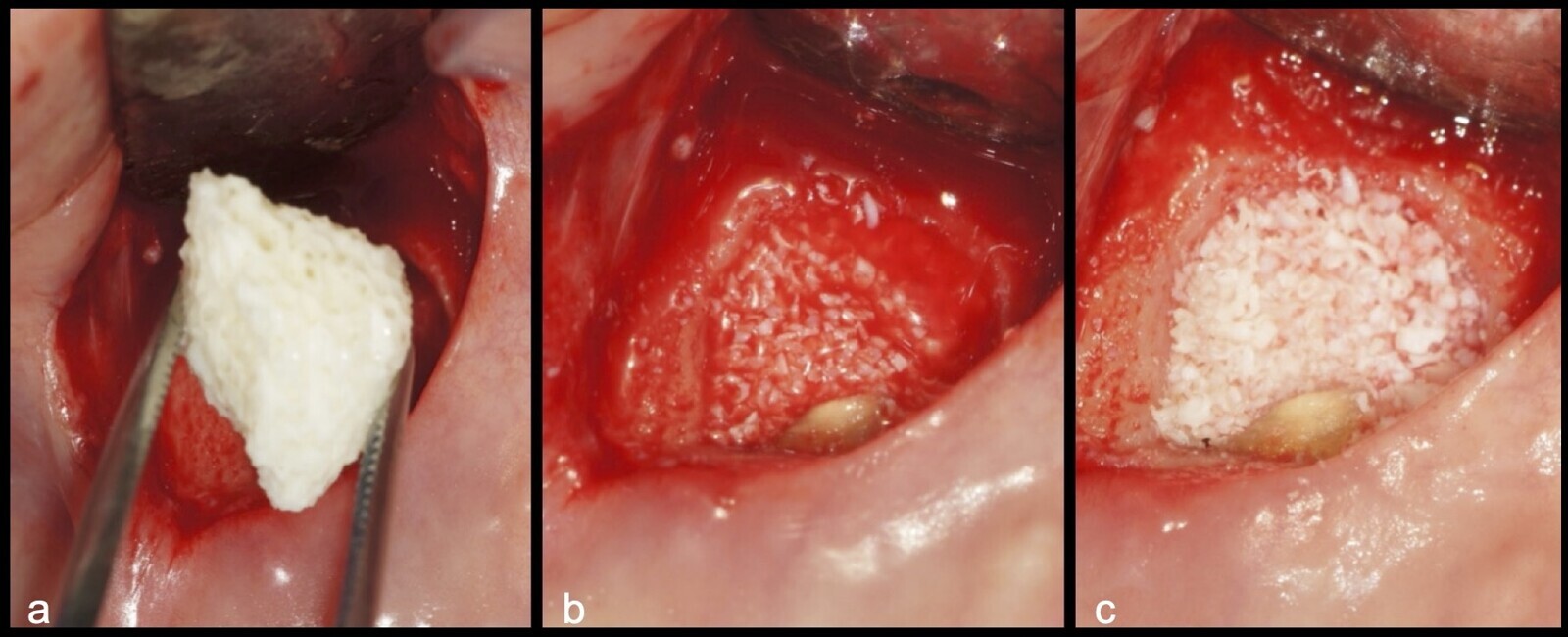 Figura 22. Secuencia del llenado del lecho quirúrgico con xeoinjerto en bloque y particulado (a, b, c).