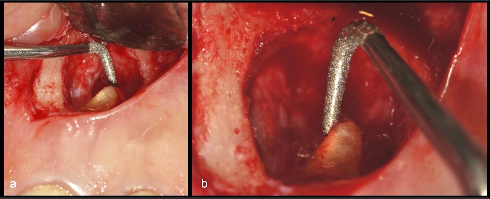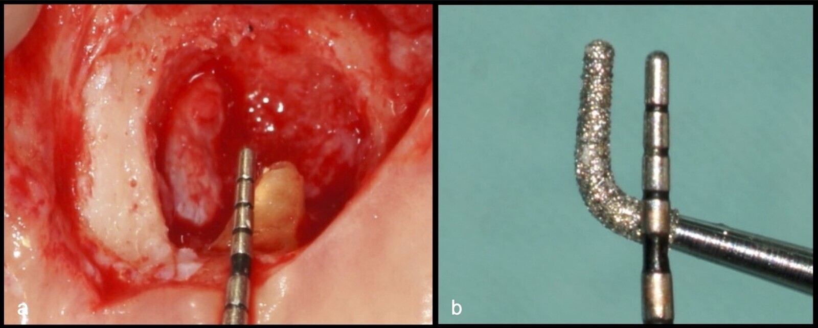Figura 14. Acceso con osteotomía selectiva utilizando el inserto redondo de punta diamantada (a). Identificación del ápice y biselado apical con el inserto plano de punta diamantada (b).