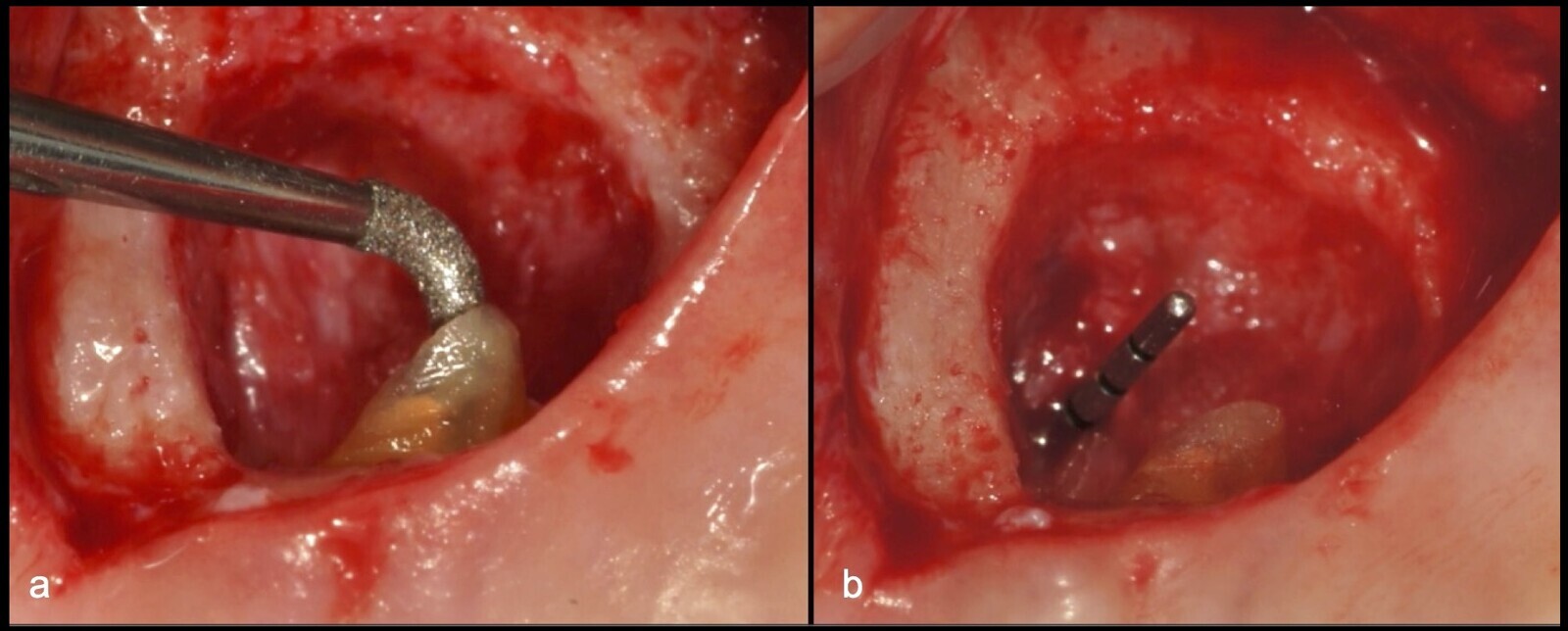 Figura 18. Finalización de la preparación del conducto radicular apical por vía retrógrada (a). Defecto óseo con comunicación palato-vestibular (b).
