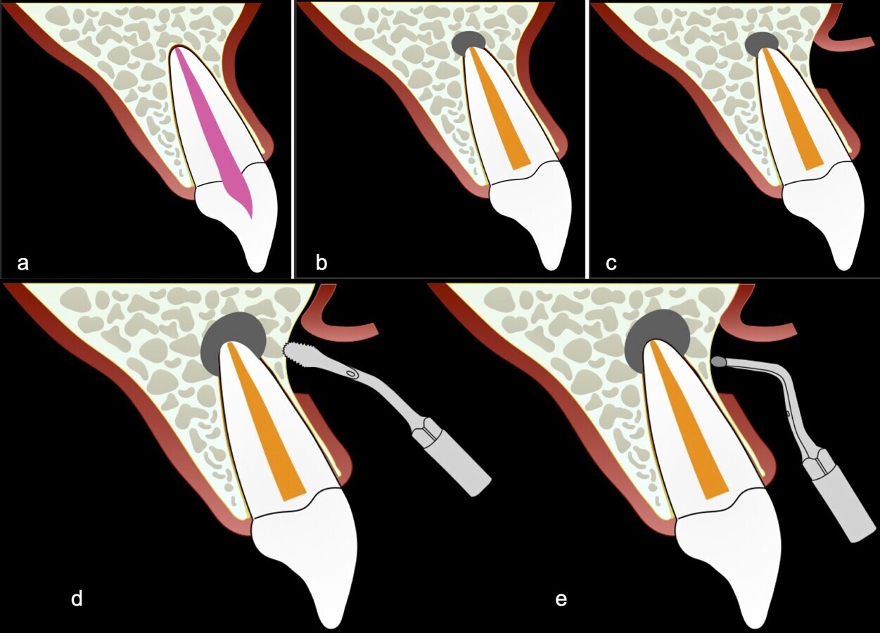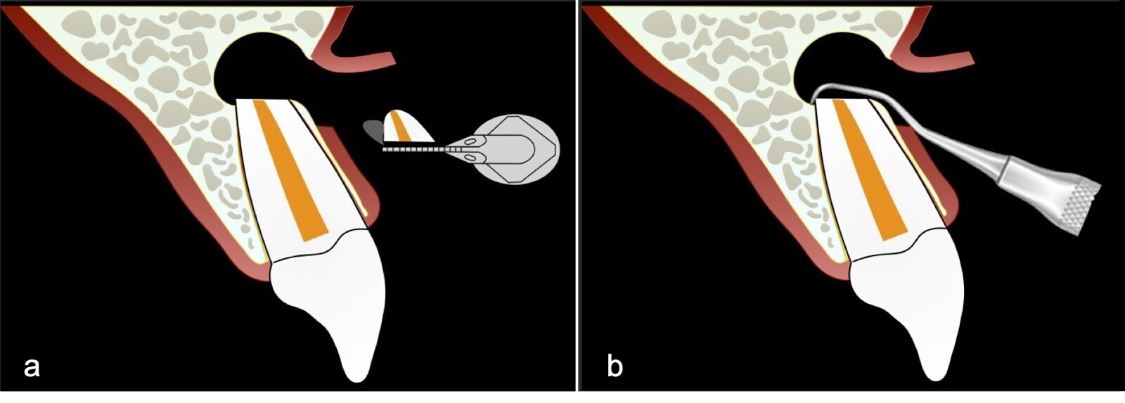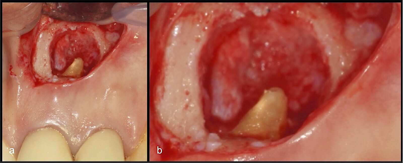 Figura 8. Excéresis (a) y curetaje apical (b) que garantice una zona limpia para la terapia endodóntica apical.