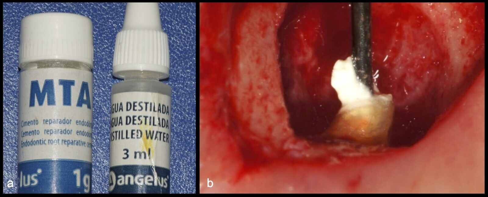 Figura 19. Agregado de Trióxido Mineral (a) para la obturación del conducto (b).
